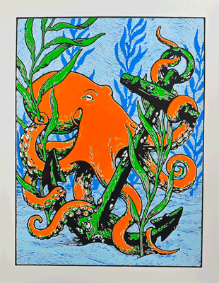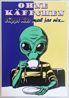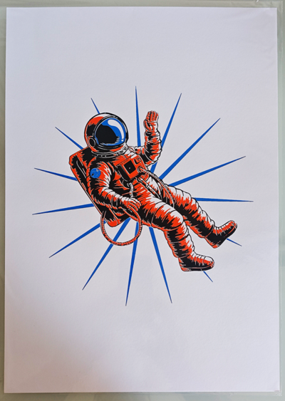 Schöne und farbkräftige Illustration vom Winke-astronaut out of Space. Siebdruck auf DIN A 3 Fotokarton 300 mg/m².